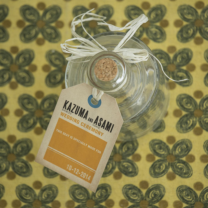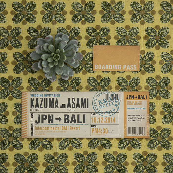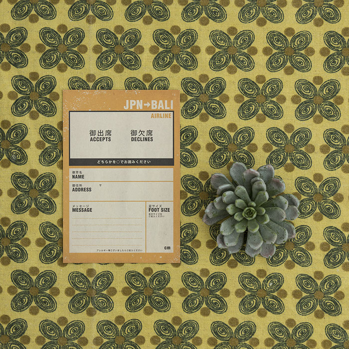 セットのイメージはまさに旅行。航空チケット風にデザインした招待状にラッゲージタグの席札などを制作。ビンテージ感のある招待状は、日本からバリへ2人の門出を祝うチケットをモチーフにデザイン。サイズもパスポートに挟めるジャストサイズ。挙式前後の旅行コンシェルジュが必要な場合の連絡先はチケットから破線で外せるようになっているので、旅行用の小さな財布に忍び込ませる事ができます。席札はラッゲージタグ風にし、引き出物にくくりつけた状態で参列者にお配りしました。全てのアイテムをまとめる封筒は全面プリントで、開封するのをワクワクさせるデザインに。