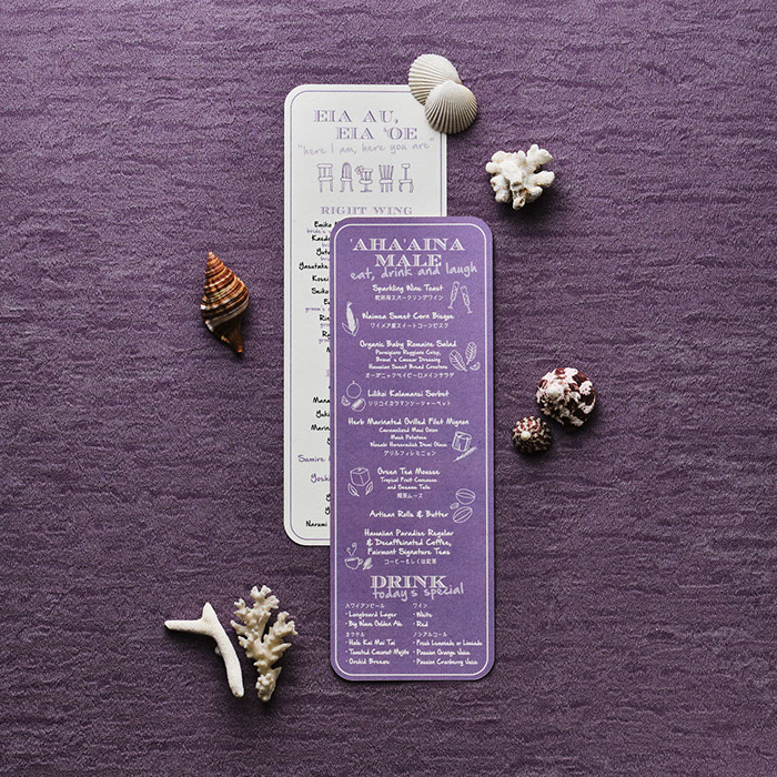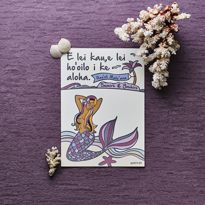 オーキッドパープルをテーマカラーに、テーブルセットに加えて美しくオリジナル感のある作品を制作いたしました。新郎新婦が心を込めて手作りした招待状の雰囲気をしっかりとデザインに含め、お気に入りのフォントを使用し、イラストを多くちりばめかわいらしいイメージに。さらに、美しいハワイの海を背景に挙式でしたので、マーメードのイラストを制作しウェルカムツリーにしました。イラスト内の水辺部分に、来賓の方々のフィンガースタンプを押していただくことで、さらにイラストが変化。挙式後に自宅に飾れるかわいくユニークな作品に仕上げました。