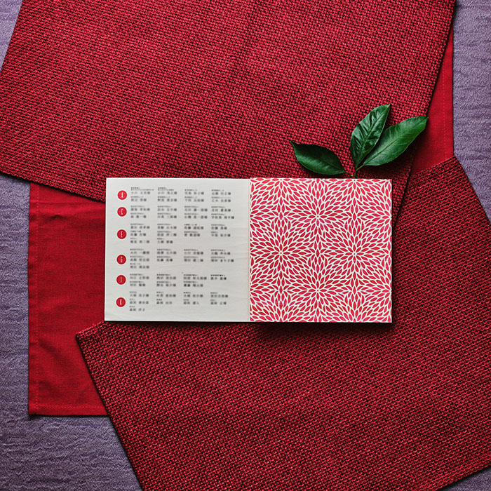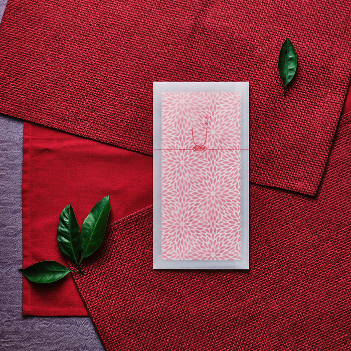 伝統的な和模様をあしらった花柄は、お花に深く関係のある新婦からのインスピレーション。和装と呉服に関係の深い新郎より「和」を意識したアイテムに仕上げました。日本文化を重んじつつ、おしゃれで愛らしく。「和」でありながら「新しい」表現には、当時では斬新なトレーシングペーパーの封筒をオリジナルで制作し、同封される全面和柄の美しい招待状を透かし表現しました。水引を封筒にあしらうことで、お祝いという寿のあしらいをデザインしました。