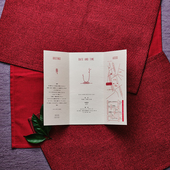 こちらのデザインは、高級和紙を使用した柔らかい招待状となっております。フルセット、または各アイテム1式より注文も可能です。下ボタンよりこちらのデザインを注文、もしくはお電話やメールにてご相談もお気軽にお申し付けください。