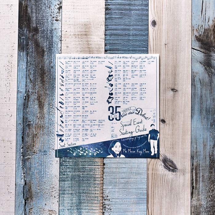 このデザインで表記される新郎新婦のご芳名は、サンプル掲載表記を同意していただいたおふたりのご好意により、実際に制作されたそのままのデザインで掲載させていただいております。(一部変更あり)