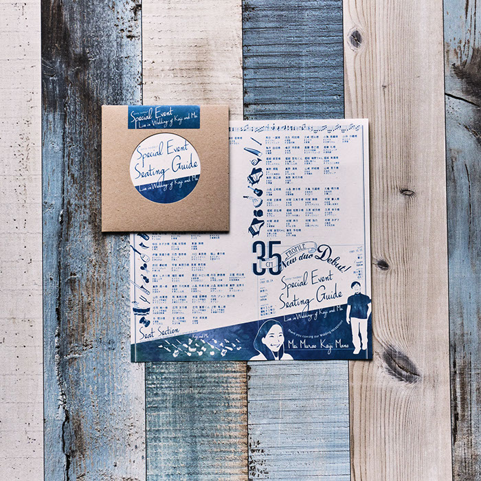 音楽家である新婦さまのために制作したBRIDESBOXです。おふたりの挙式をコンサートに見立て、幸せな二人が奏でるアンサンブルのスペシャルイベントへ大切な方々を招待する、そんな素敵なコンセプトでデザインしました。コンサートチケットは、リクエスト部分が切り離せるように、チケットケースには会場までの地図を楽譜のようにデザインしのせました。クロード・モネの絵画の雰囲気や、会場であるリストランテASOのイニシャルプレートの空の色をとても気に入っていたことから、水彩画ををオリジナル制作。淡く優しい中に、しっかりとした個性もある作品です。席札はレコード風のCD、お名前が印字されています。参列者それぞれに新婦さまが楽曲を録音してある唯一無二の席札です。会場入り口では、席次表が挿入されたCDケースが渡されました。ケースにはお食事のメニューが。席までお持ちいただき、卓上のCDをケースに入れていただく。そんな素敵なコンサートコンセプトのBRIDESBOXです。