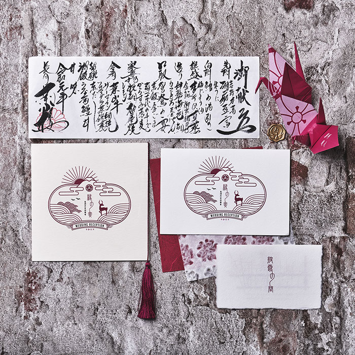 和モダンな雰囲気は、格式高い奈良菊水楼の披露宴会場と、そこに華やぐお若い新婚のおふたりのイメージを結びつけます。由緒ある御家族の披露の宴として、デザインには日本らしさと、奈良の鹿、名字にちなんで番(つが)いの烏(カラス)に、ご実家の葉山をイメージした穏やかな海。新婦さまの御家系が緑茶との深い縁があるとのことで、茶畑をデザインした優雅な曲線に、日の出と富士山の縁起物で構成しました。