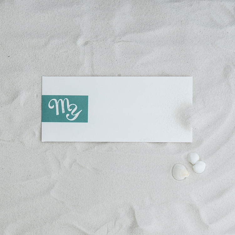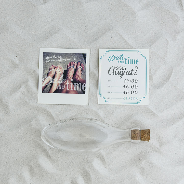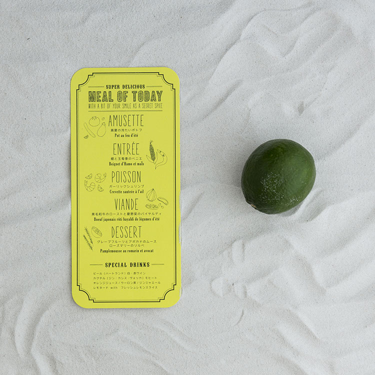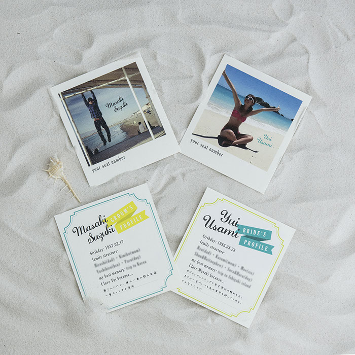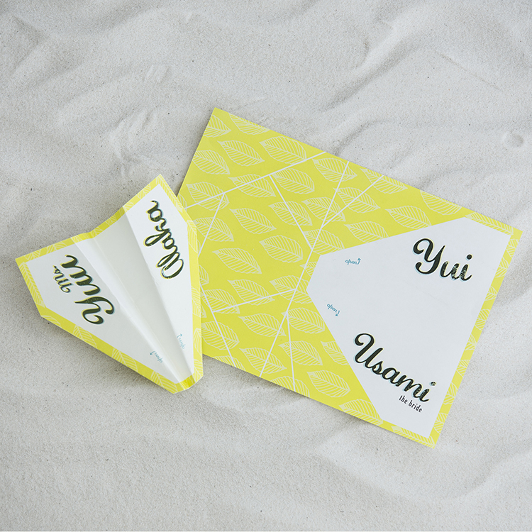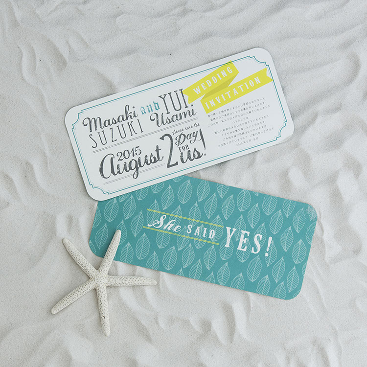 爽やかなシトラスの香りがするようなカラースキームは、新郎新婦らしい明るいエネルギーを表現。西洋のレストランで使用されるようなチョークボードデザインを参考に、レストラン挙式にマッチするようデザインしました。長くお付き合いをされていたお二人のプロポースは感動的だったとのお話から、「She said YES!」「I said YES!」と、感動を招待状のメインフレーズとしました。招待状は封筒の中に紐で結ばれ、皆さんのお手元に届くようにいたしました。多くの楽しい想い出があるおふたりの象徴となるポラロイド写真も、日時や席次表アイテムとして制作させていただきました。