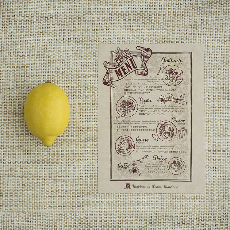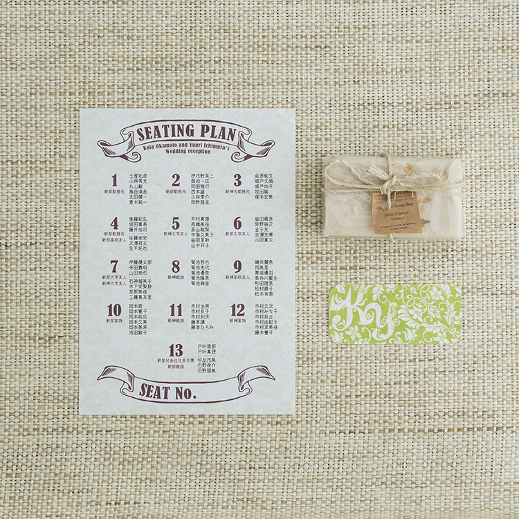 披露宴で使用するお食事のメニューは、丸くまるめられ麻ひもで結ばれた状態でお皿の上に飾られ、大切な一つのインテリア要素として確立しました。また、思いを込めて決められたその一つ一つのコースのイラストまでオリジナルでデザインしました。席次表はクラシックにまとめあげ、当日案内の方が手書きで参列者の行き着く先の席番号を書く事により披露宴自体の温かみを表現し、美しくエレガントな挙式に合うBRIDESBOXが完成しました。