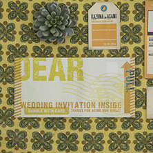セットのイメージはまさに旅行。航空チケット風にデザインした招待状にラッゲージタグの席札などを制作。ビンテージ感のある招待状は、日本からバリへ2人の門出を祝うチケットをモチーフにデザイン。サイズもパスポートに挟めるジャストサイズ。挙式前後の旅行コンシェルジュが必要な場合の連絡先はチケットから破線で外せるようになっているので、旅行用の小さな財布に忍び込ませる事ができます。席札はラッゲージタグ風にし、引き出物にくくりつけた状態で参列者にお配りしました。全てのアイテムをまとめる封筒は全面プリントで、開封するのをワクワクさせるデザインに。