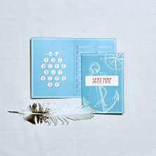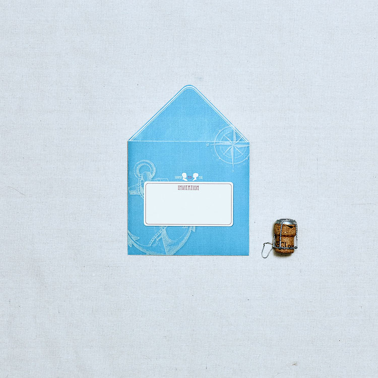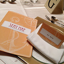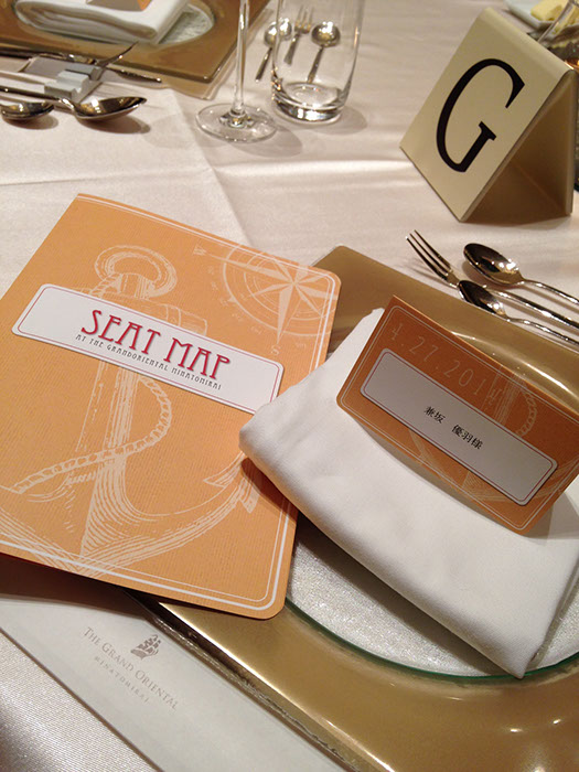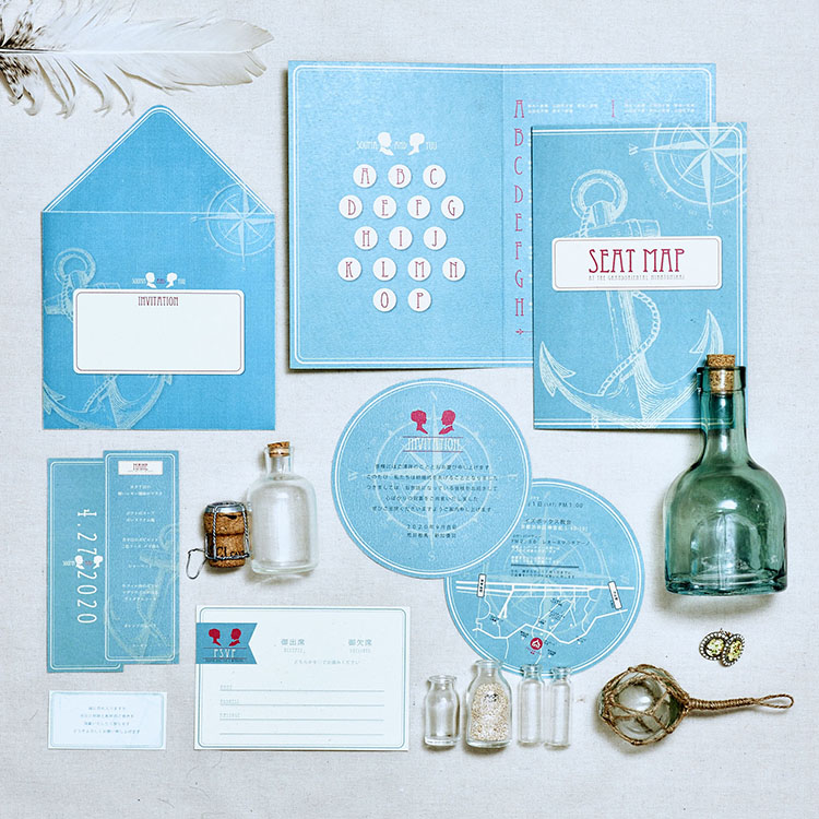 マリーンのエレメントをあしらい、マリーンブルーでデザイン。新郎新婦の横顔をイラスト化し、全てのアイテムにロゴのように散りばめました。実際にお二人に制作したアイテムは、フロアコンセプトであり新婦さまのお好きなカラーであるオレンジで制作しました。