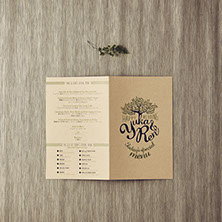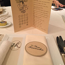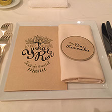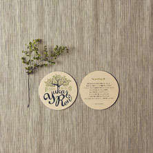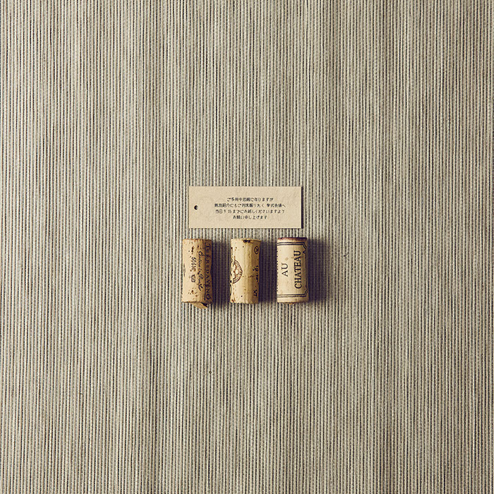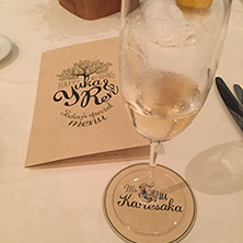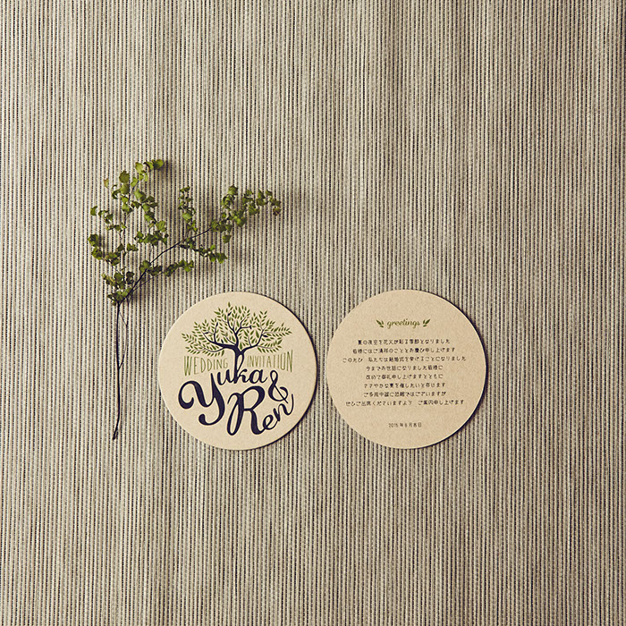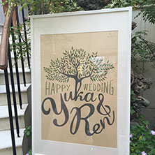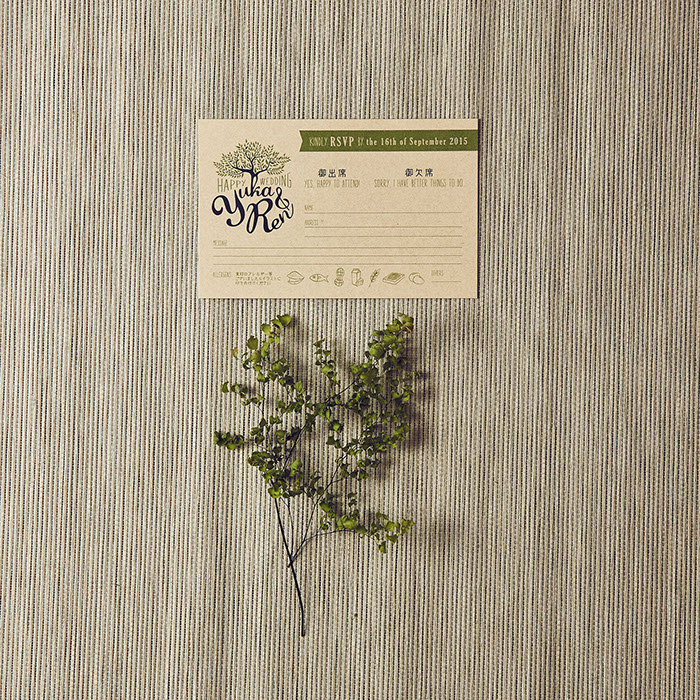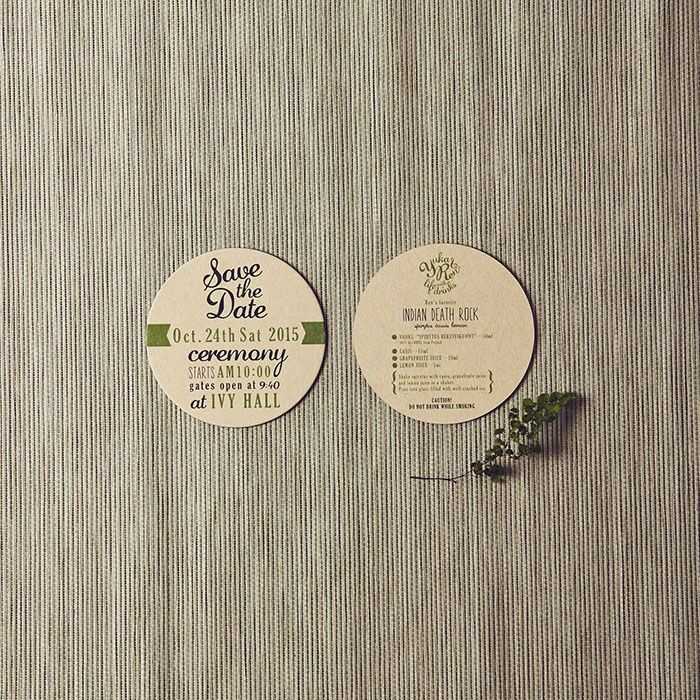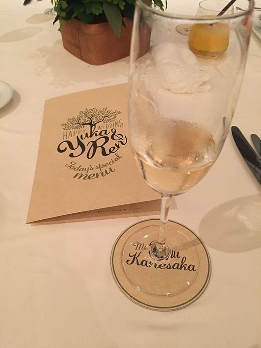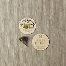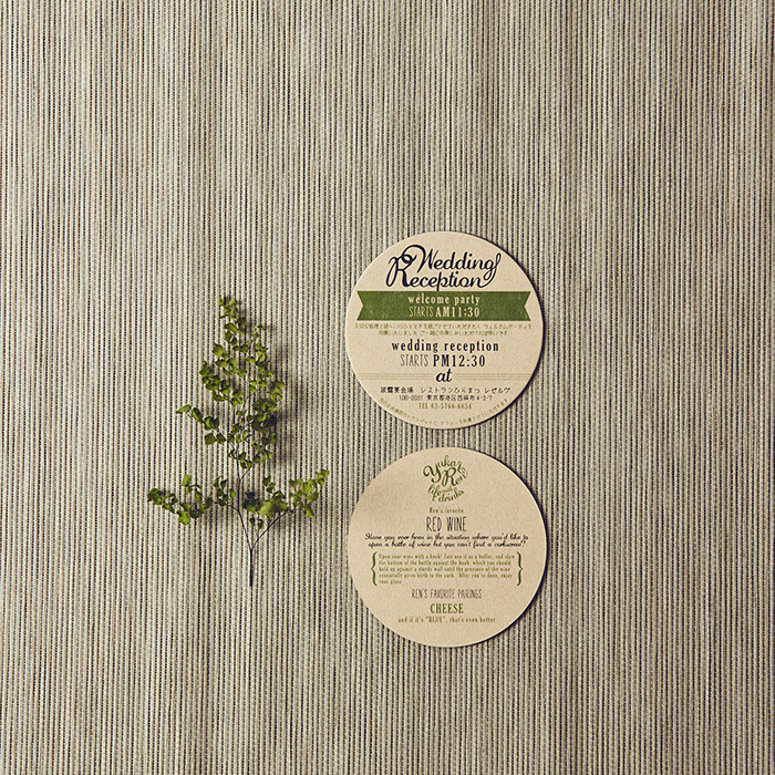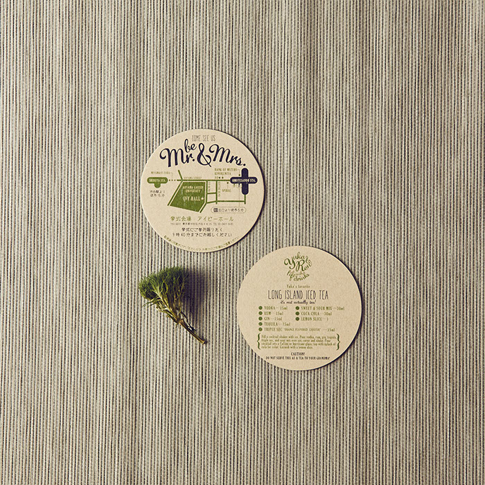おふたりが愛し共感している「TREE」というお話があることを知り、オリーブの木をモチーフにロゴをつくり、コースターアイテムに展開しました。それぞれのコースターには、おふたりが愛しているお酒のレシピや、楽しみ方を記載。もらって楽しい、もらって使える招待状にいたしました。披露宴でも、同様にコースターで制作した席次を使い、まとめておしゃれなアイテムになりました。さらにロゴは、ウェルカムボードとしても会場を飾りました。おふたりに制作したロゴをスタンプにすることで、タグやプチギフト等に使用し特別なオリジナルアイテムを量産できました。