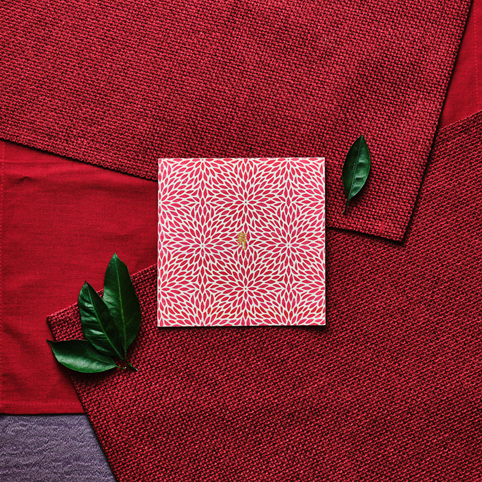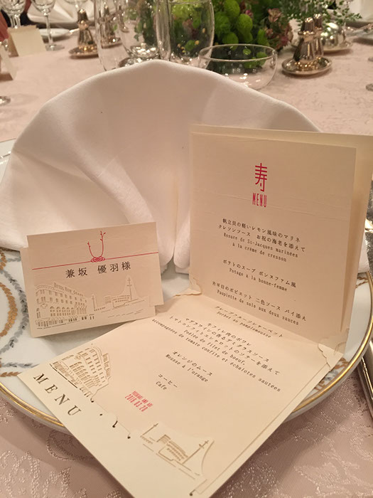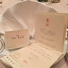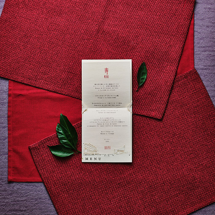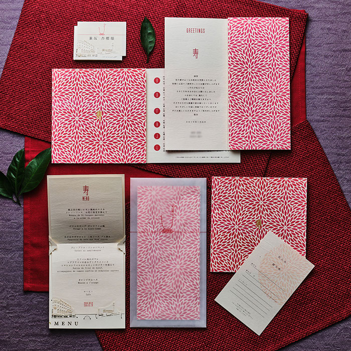 伝統的な和模様をあしらった花柄は、お花に深く関係のある新婦からのインスピレーション。和装と呉服に関係の深い新郎より「和」を意識したアイテムに仕上げました。日本文化を重んじつつ、おしゃれで愛らしく。「和」でありながら「新しい」表現には、当時では斬新なトレーシングペーパーの封筒をオリジナルで制作し、同封される全面和柄の美しい招待状を透かし表現しました。水引を封筒にあしらうことで、お祝いという寿のあしらいをデザインしました。