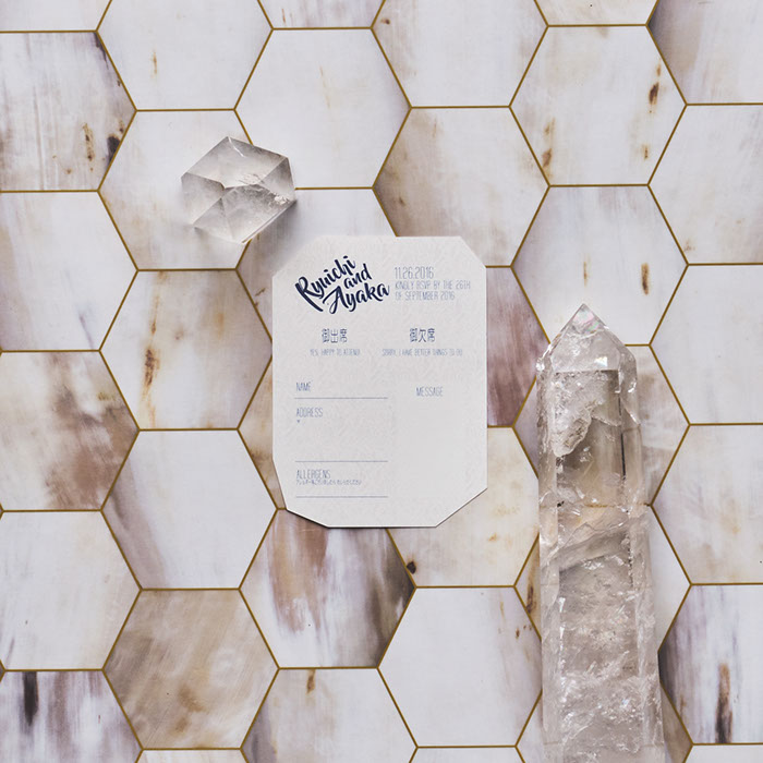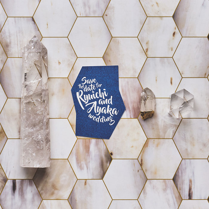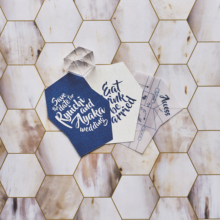 人生は宝。出会いも宝。そして小さな命という宝を授かったおふたりにデザインしたブライズボックスです。インドネシアの国に縁があり出会われたおふたり。国の伝統工芸であるバティックをオリジナルの柄で制作したいとのご要望から、おふたりそれぞれの今までの軌跡・趣味・新婦に宿る小さな命などをモチーフに、バティックの柄風にデザインパターンを作成。また、招待状はコンセプトを「JEWEL」大切な宝物とし、アイテム全てが違う形の宝石を連想させるデザインにいたしました。