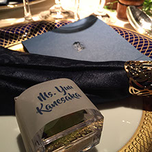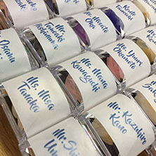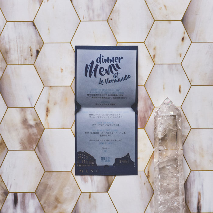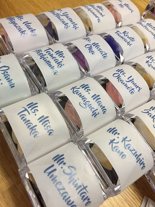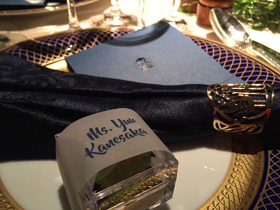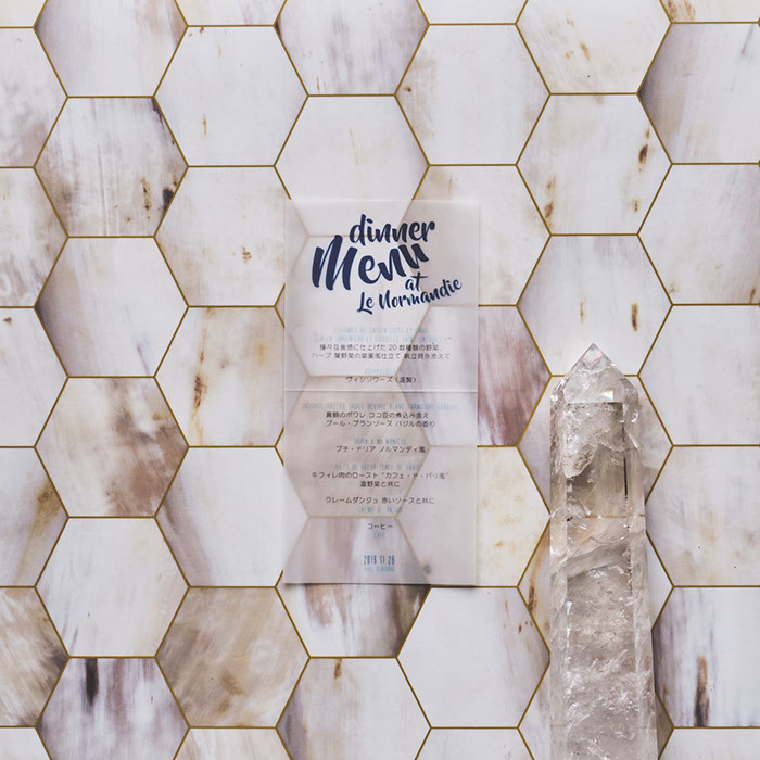 提案させていただいた宝石ソープは、引き出物でありながら席札になるように。また、会場指定の台座を使い、オリジナル感が出るようにメニューをデザイン。透き通る紙も使用し、艶のある輝くBRIDESBOXになりました。プロフィール映像もスタイルを合わせたおふたりらしいビデオを作成させていただき、素晴らしい宝石のような輝くコンセプト統一が実現しました。