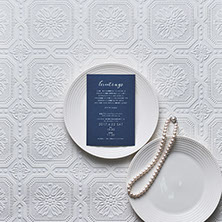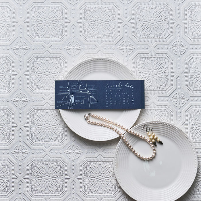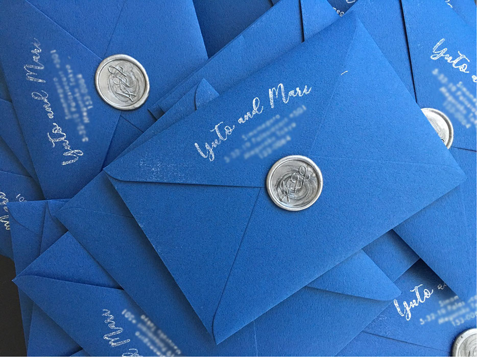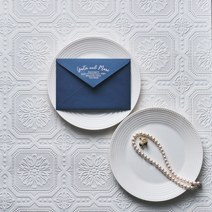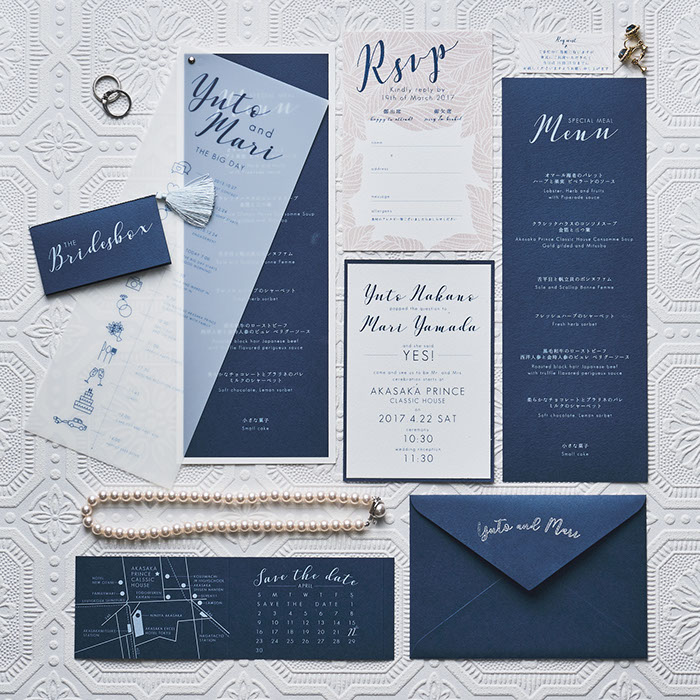 スマートでかっこいい、エレガントなBRIDESBOXです。イギリス・ヨーロッパの雰囲気に、ウエイトのあるロイヤルブルー「MAZARINE」をカラースキームとしたコンセプトでデザインしました。風合いのある紙に白印刷を施すことにより、より高級感を。タッセルとスタンプには、プラチナカラーを使いました。