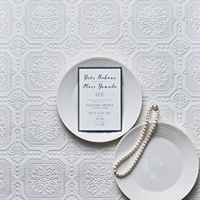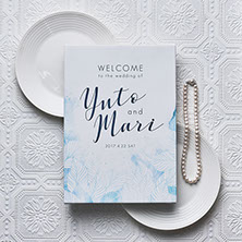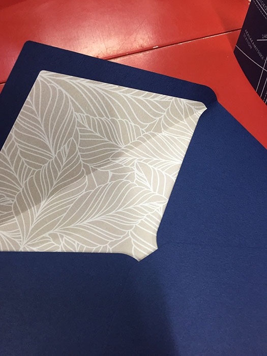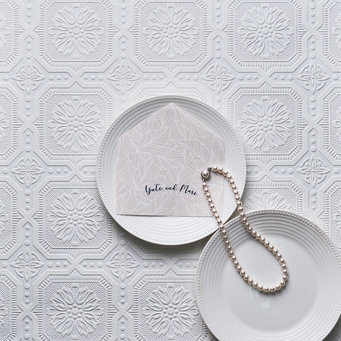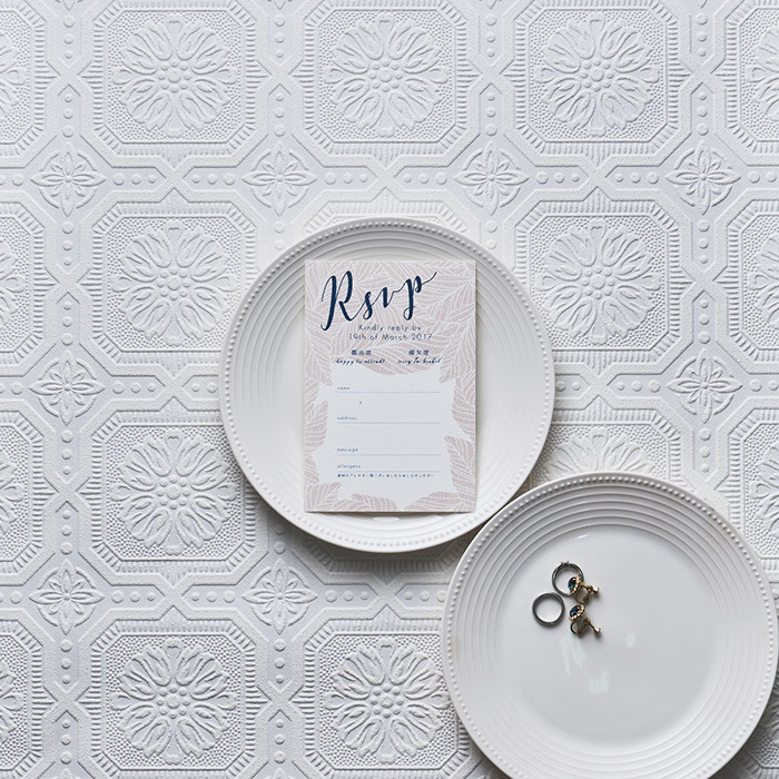 返信葉書には、ウェルカムボードと封筒内側の装飾紙でも使用したリーフ柄をあしらい、全体的なクールさを優しく包み込む柔らかい演出も!