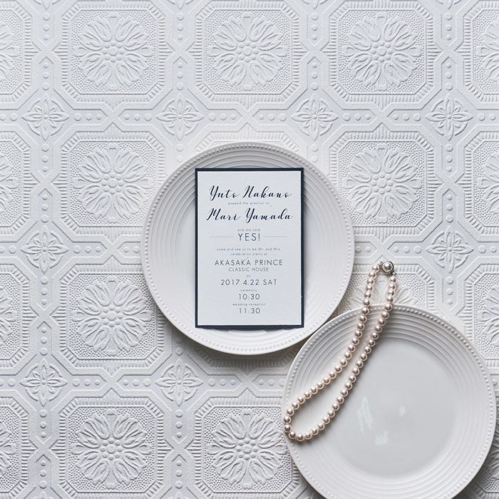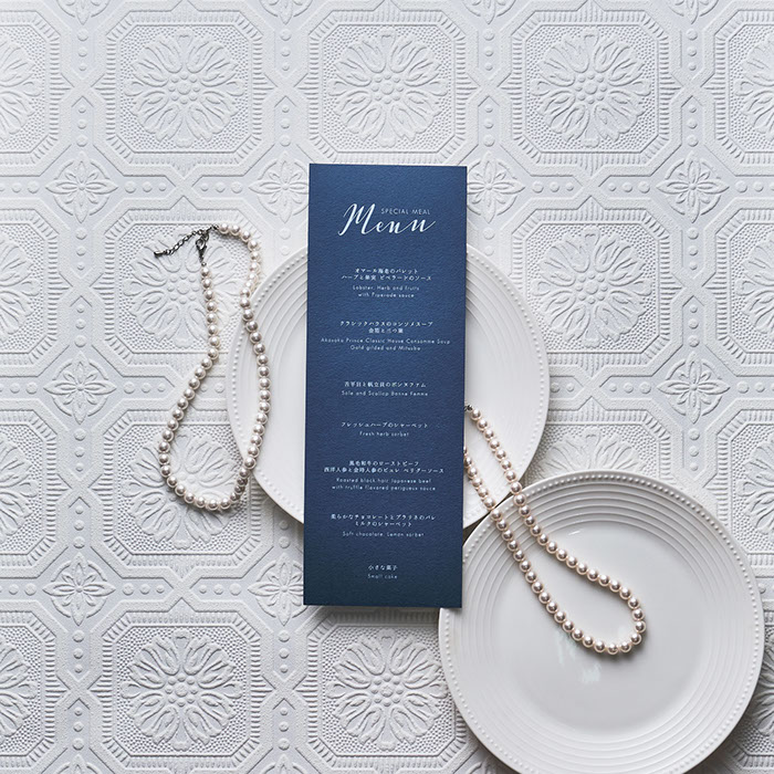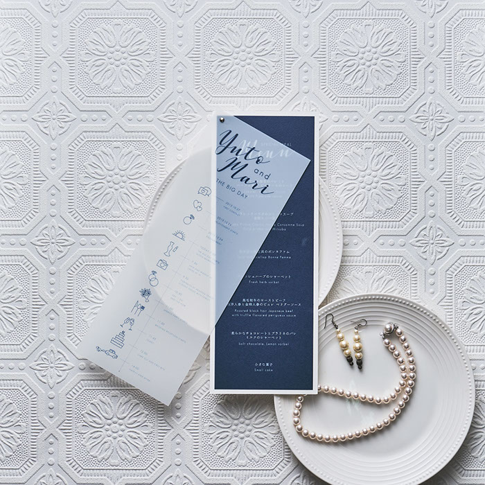 招待状と挙式当日の席次兼メニューには、サイズを変えた合わせ紙でエレガントさと重厚感をプラス。楽しさの演出として、出会いから描かれる挙式スケジュールもデザインしました。