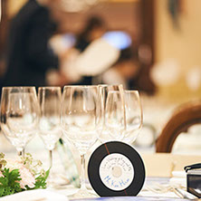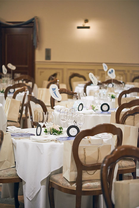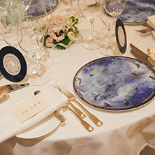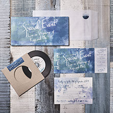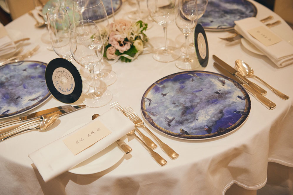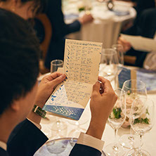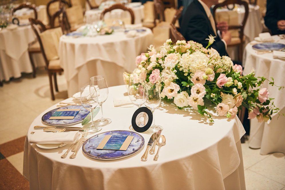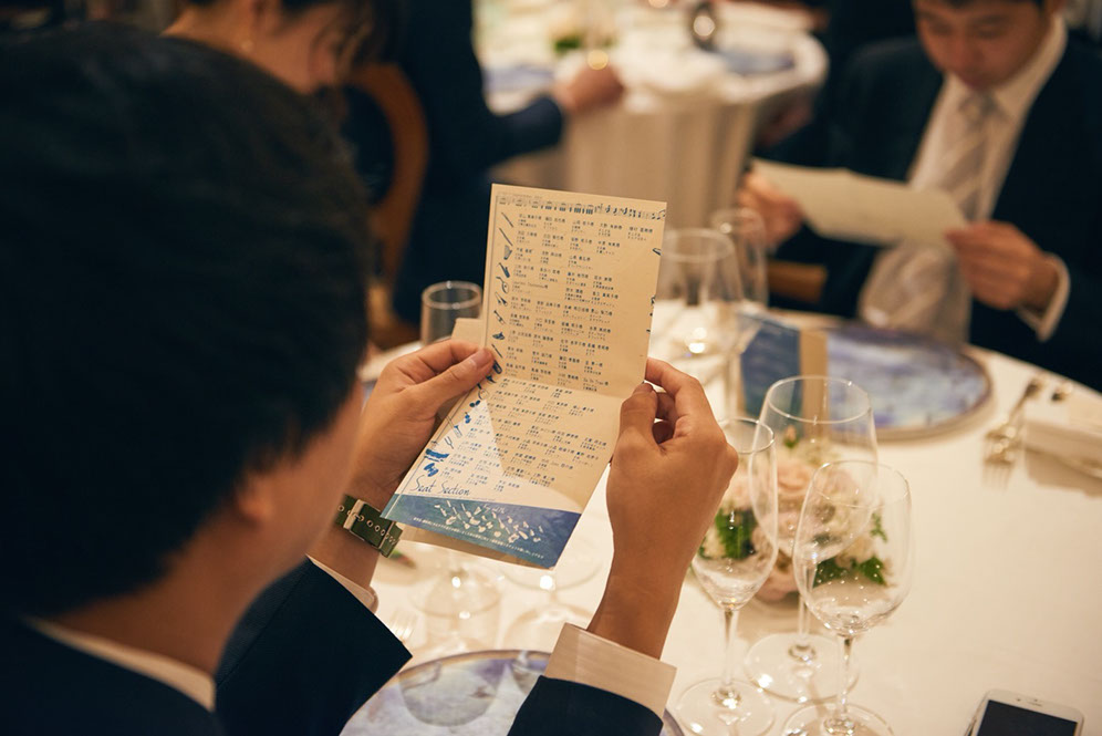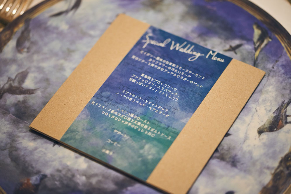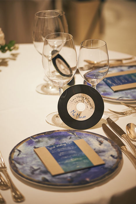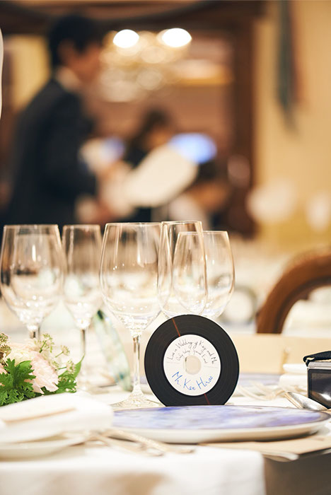 音楽家である新婦さまのために制作したBRIDESBOXです。おふたりの挙式をコンサートに見立て、幸せな二人が奏でるアンサンブルのスペシャルイベントへ大切な方々を招待する、そんな素敵なコンセプトでデザインしました。コンサートチケットは、リクエスト部分が切り離せるように、チケットケースには会場までの地図を楽譜のようにデザインしのせました。クロード・モネの絵画の雰囲気や、会場であるリストランテASOのイニシャルプレートの空の色をとても気に入っていたことから、水彩画ををオリジナル制作。淡く優しい中に、しっかりとした個性もある作品です。席札はレコード風のCD、お名前が印字されています。参列者それぞれに新婦さまが楽曲を録音してある唯一無二の席札です。会場入り口では、席次表が挿入されたCDケースが渡されました。ケースにはお食事のメニューが。席までお持ちいただき、卓上のCDをケースに入れていただく。そんな素敵なコンサートコンセプトのBRIDESBOXです。