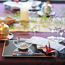 イメージにある手書きのお食事献立表は、京都菊水楼の板長さまが直筆で丁寧にお書きになられる菊水楼の式典オプションです。菊水楼の挙式にご興味のある方は、直接会場までご連絡ください。