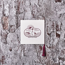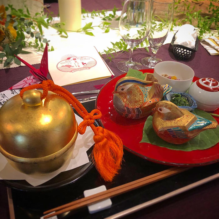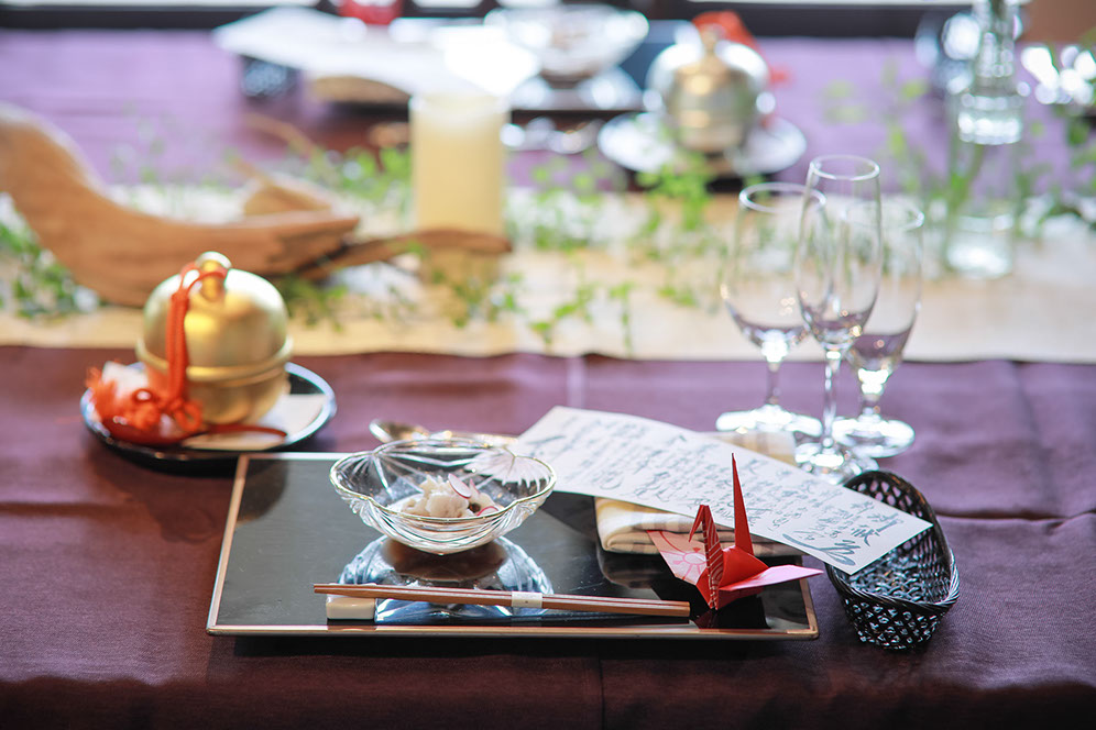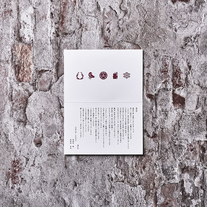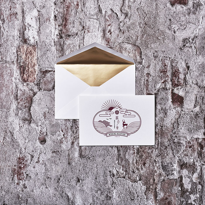 和モダンな雰囲気は、格式高い奈良菊水楼の披露宴会場と、そこに華やぐお若い新婚のおふたりのイメージを結びつけます。由緒ある御家族の披露の宴として、デザインには日本らしさと、奈良の鹿、名字にちなんで番(つが)いの烏(カラス)に、ご実家の葉山をイメージした穏やかな海。新婦さまの御家系が緑茶との深い縁があるとのことで、茶畑をデザインした優雅な曲線に、日の出と富士山の縁起物で構成しました。