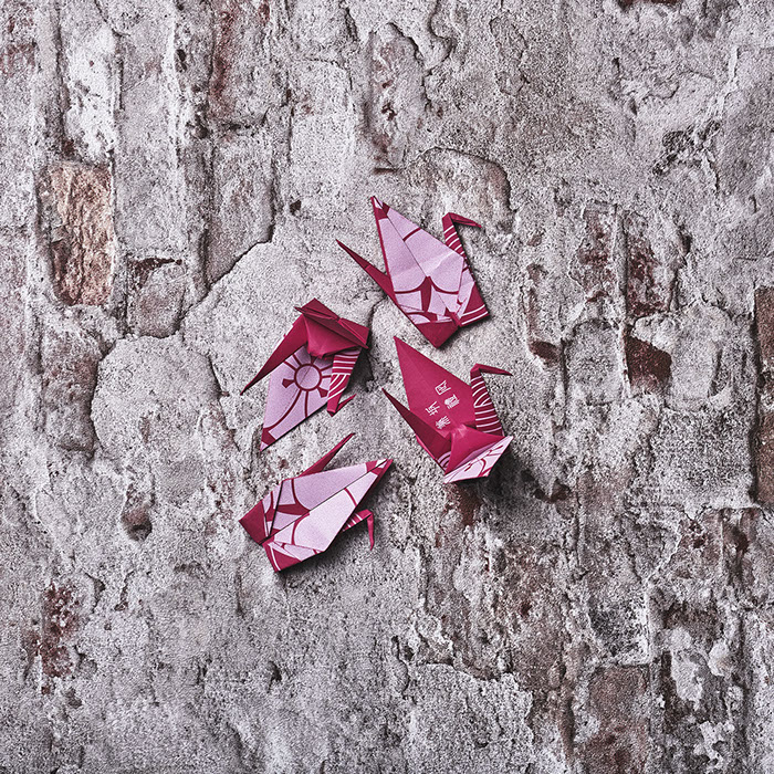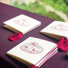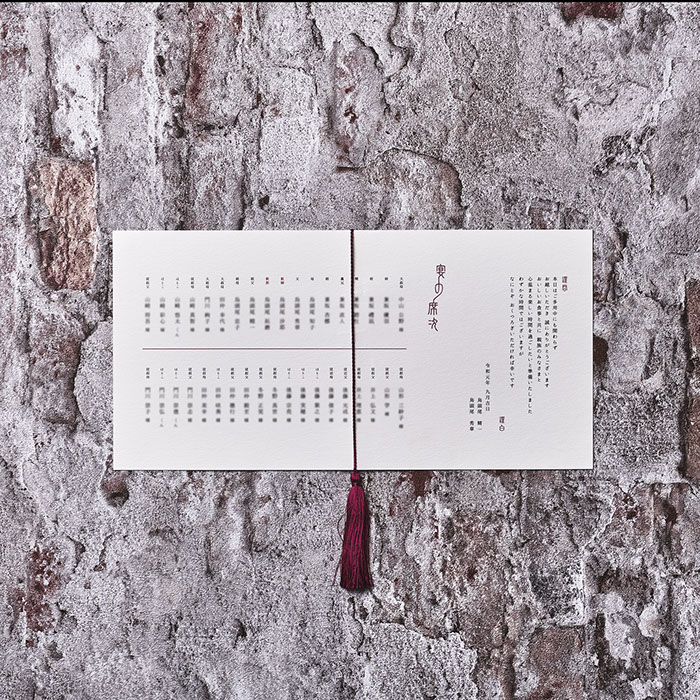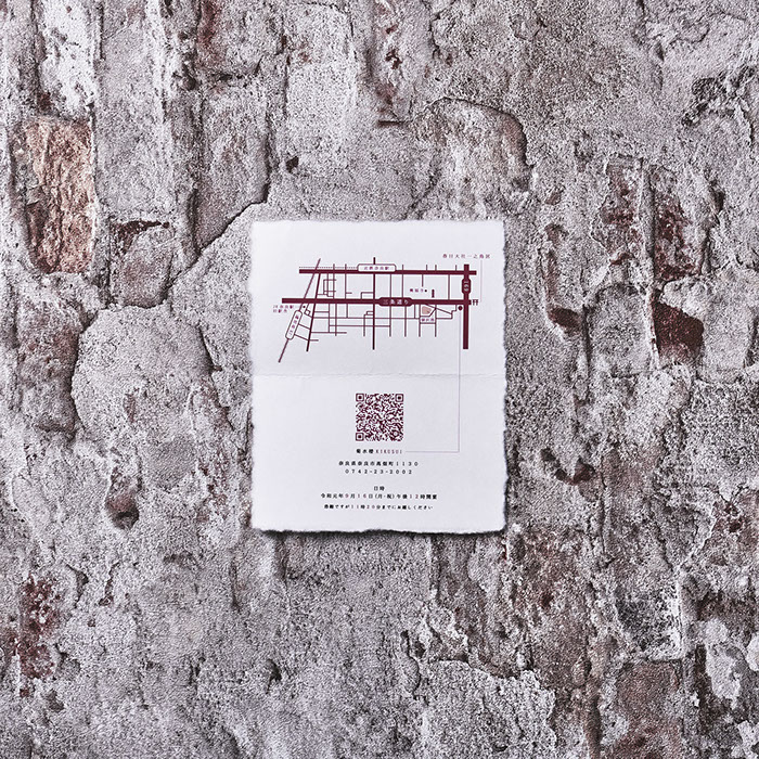 手ちぎりの和紙には地図を、触れて揉んで風合いもでます。席札には家紋をあしらった折り鶴。美しい菊水楼のお食事に華を添えました。